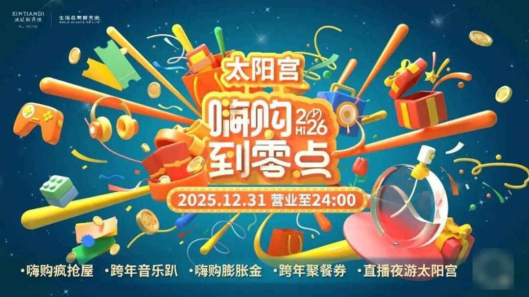 瑞虹新天地瑞虹新天地太阳宫将于2025年12月31日延时营业至零点,当晚活动将从19:00开启,嗨购疯抢屋(凭消费小票参与30秒限时抢礼)、不打烊狂欢促(会员消费满额即赠最高400元“嗨购膨胀金”及100元“跨年聚餐券”,跨年当晚专享)、跨年音乐趴(20:30起温暖开唱,经典金曲陪你倒数迎新年)以及线上直播夜游太阳宫,打造一场融合购物、音乐、互动与福利的沉浸式跨年狂欢。