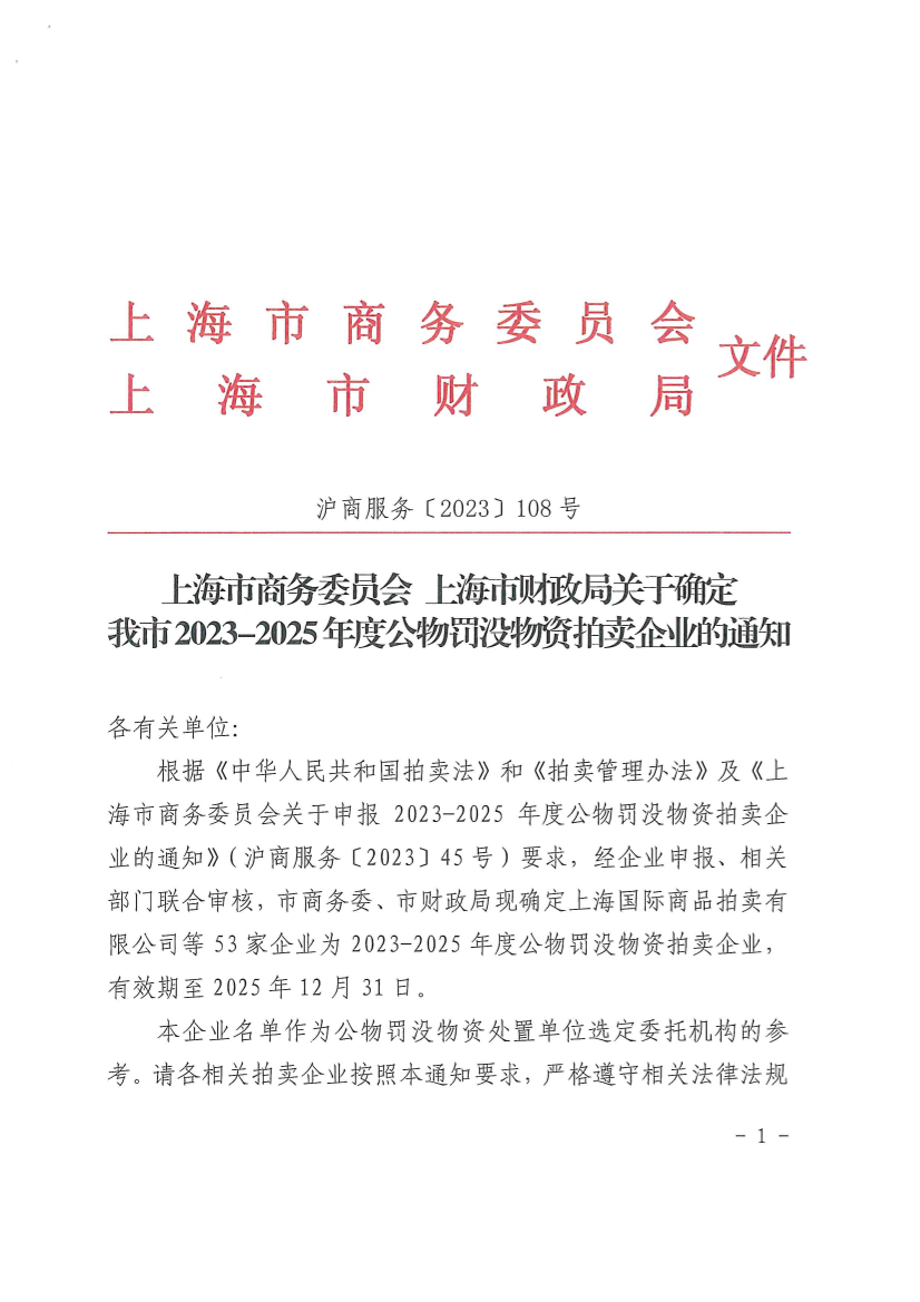 根据《中华人民共和国拍卖法》和《拍卖管理办法》及《上海市商务委员会关于申报2023-2025年度公物罚没物资拍卖企业的通知》(沪商服务〔2023〕45号)要求,经企业申报、相关部门联合审核,市商务委、市财政局现确定上海国际商品拍卖有限公司等53家企业为2023-2025年度公物罚没物资拍卖企业,有效期至2025年12月31日。