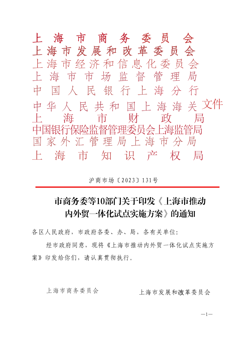 市商务委等10部门关于印发《上海市推动内外贸一体化试点实施方案》的通知