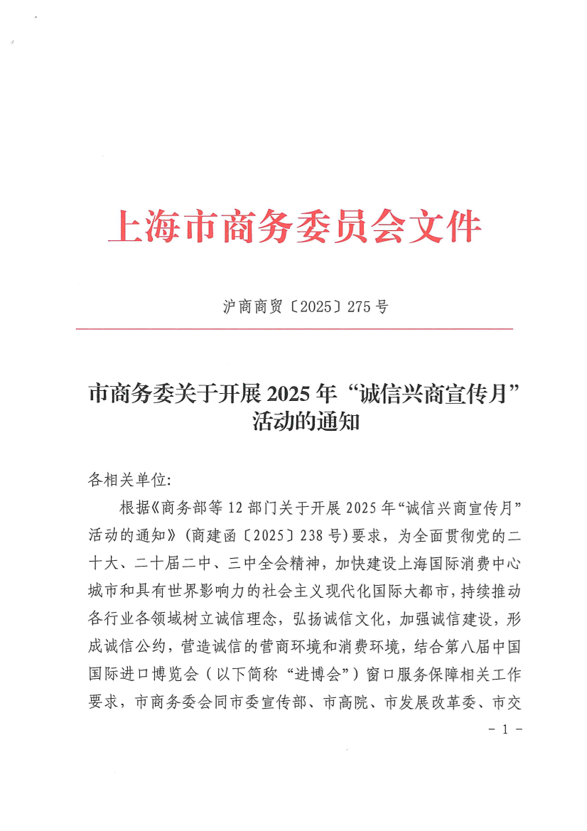 根据《商务部等12部门关于开展2025年“诚信兴商宣传月”活动的通知》(商建函〔2025〕238号)要求,为全面贯彻党的二十大、二十届二中、三中全会精神,加快建设上海国际消费中心城市和具有世界影响力的社会主义现代化国际大都市,持续推动各行业各领域树立诚信理念,弘扬诚信文化,加强诚信建设,形成诚信公约,营造诚信的营商环境和消费环境,结合第八届中国国际进口博览会(以下简称“进博会”)窗口服务保障相关工作要求,市商务委会同市委宣传部、市高院、市发展改革委、市交通委、市文化旅游局、市市场监管局、市国资委、上海海关、市税务局、国家外汇管理局上海市分局、市消保委等部门,定于2025年9月在我市开展“诚信兴商宣传月”(以下简称“宣传月”)活动。现将有关事项通知如下: