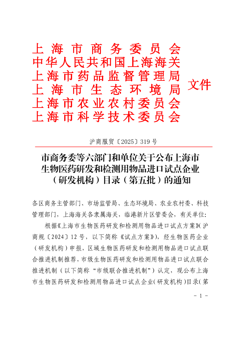 根据《上海市生物医药研发和检测用物品进口试点方案》(沪商规〔2024〕12号,以下简称《试点方案》),经生物医药企业(研发机构)申报,区域生物医药研发和检测用物品进口试点联合推进机制推荐,市级生物医药研发和检测用物品进口试点联合推进机制(以下简称“市级联合推进机制”)认定,现公布上海市生物医药研发和检测用物品进口试点企业(研发机构)目录(第五批)。