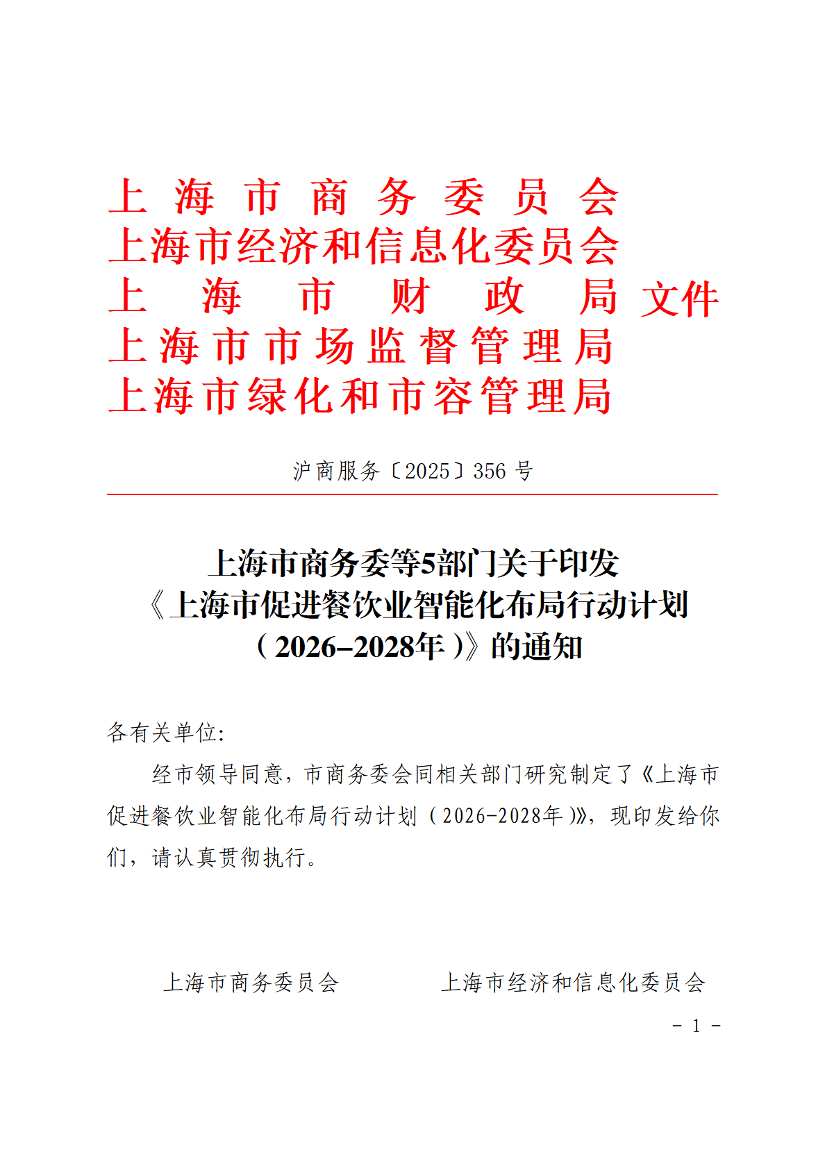 经市领导同意,市商务委会同相关部门研究制定了《上海市促进餐饮业智能化布局行动计划(2026-2028年)》,现印发给你们,请认真贯彻执行。