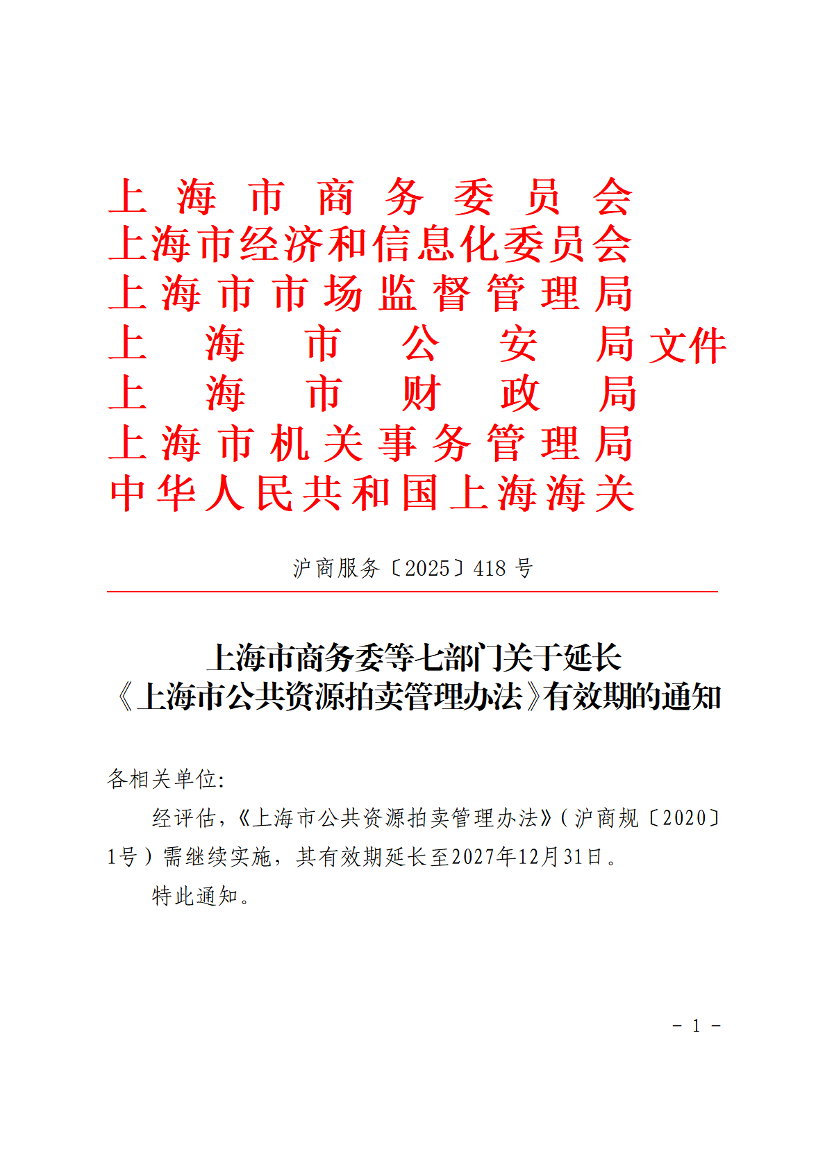 经评估,《上海市公共资源拍卖管理办法》(沪商规〔2020〕1号)需继续实施,其有效期延长至2027年12月31日。