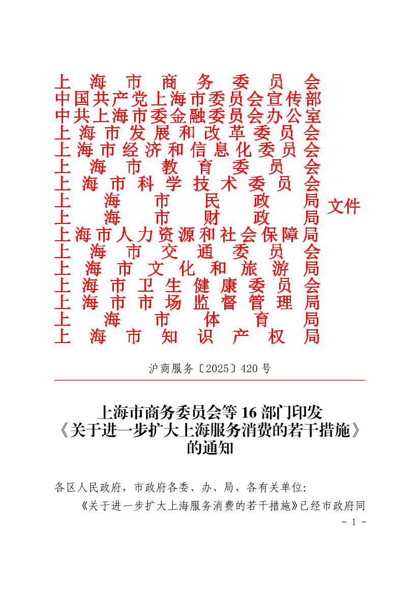 上海市商务委员会等16部门印发《关于进一步扩大上海服务消费的若干措施》的通知