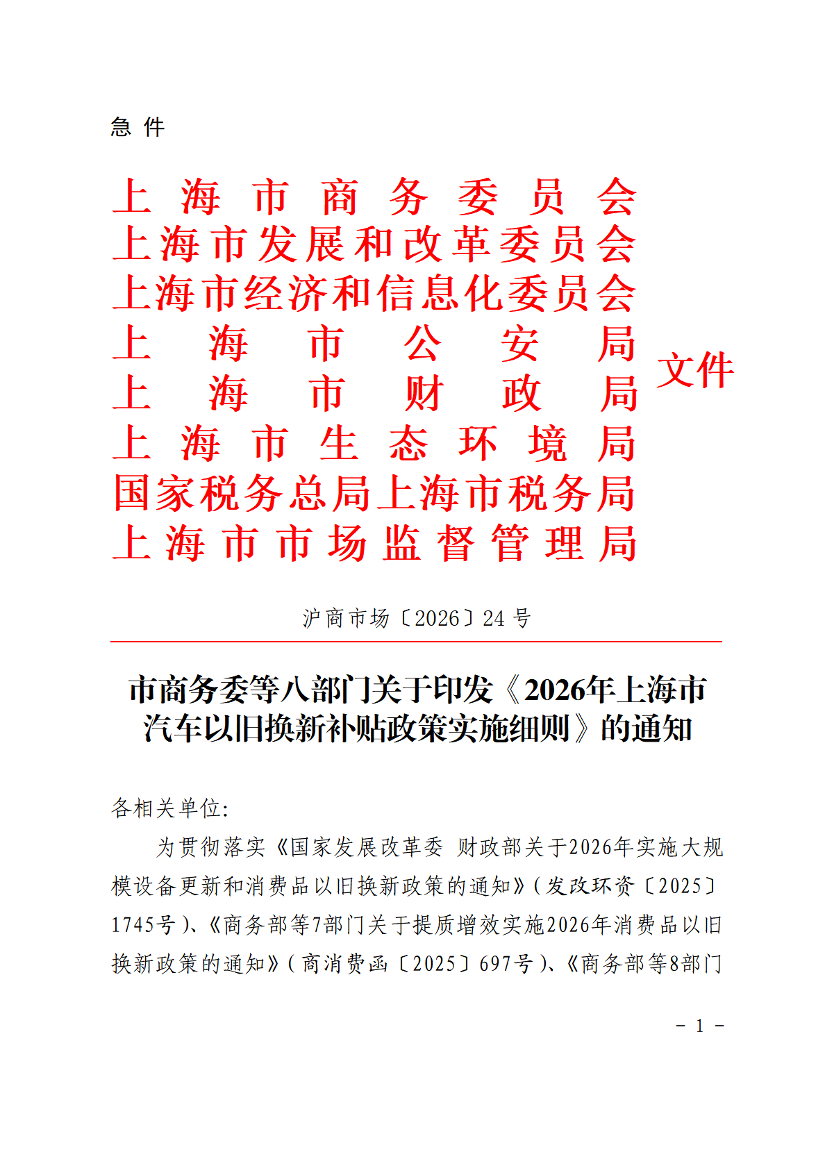 为贯彻落实《国家发展改革委 财政部关于2026年实施大规模设备更新和消费品以旧换新政策的通知》(发改环资〔2025〕1745号)、《商务部等7部门关于提质增效实施2026年消费品以旧换新政策的通知》(商消费函〔2025〕697号)、《商务部等8部门办公厅关于印发<2026年汽车以旧换新补贴实施细则>的通知》(商办消费函〔2025〕467号)和《关于上海市贯彻实施2026年大规模设备更新和消费品以旧换新政策的通知》(沪发改环资〔2026〕18号)要求,做好2026年我市汽车以旧换新工作,现将《2026年上海市汽车以旧换新补贴政策实施细则》印发给你们,请认真按照执行。
