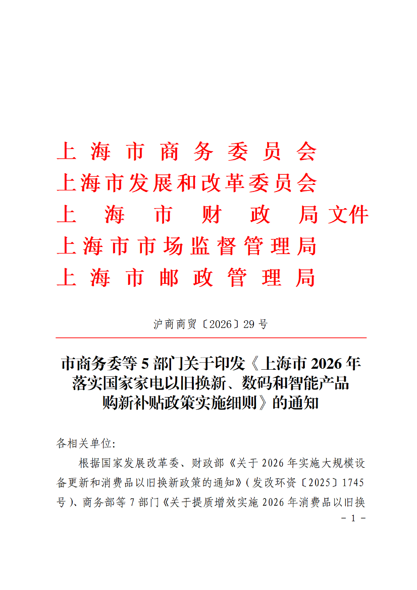 市商务委等5部门关于印发《上海市2026年落实国家家电以旧换新、数码和智能产品购新补贴政策实施细则》的通知