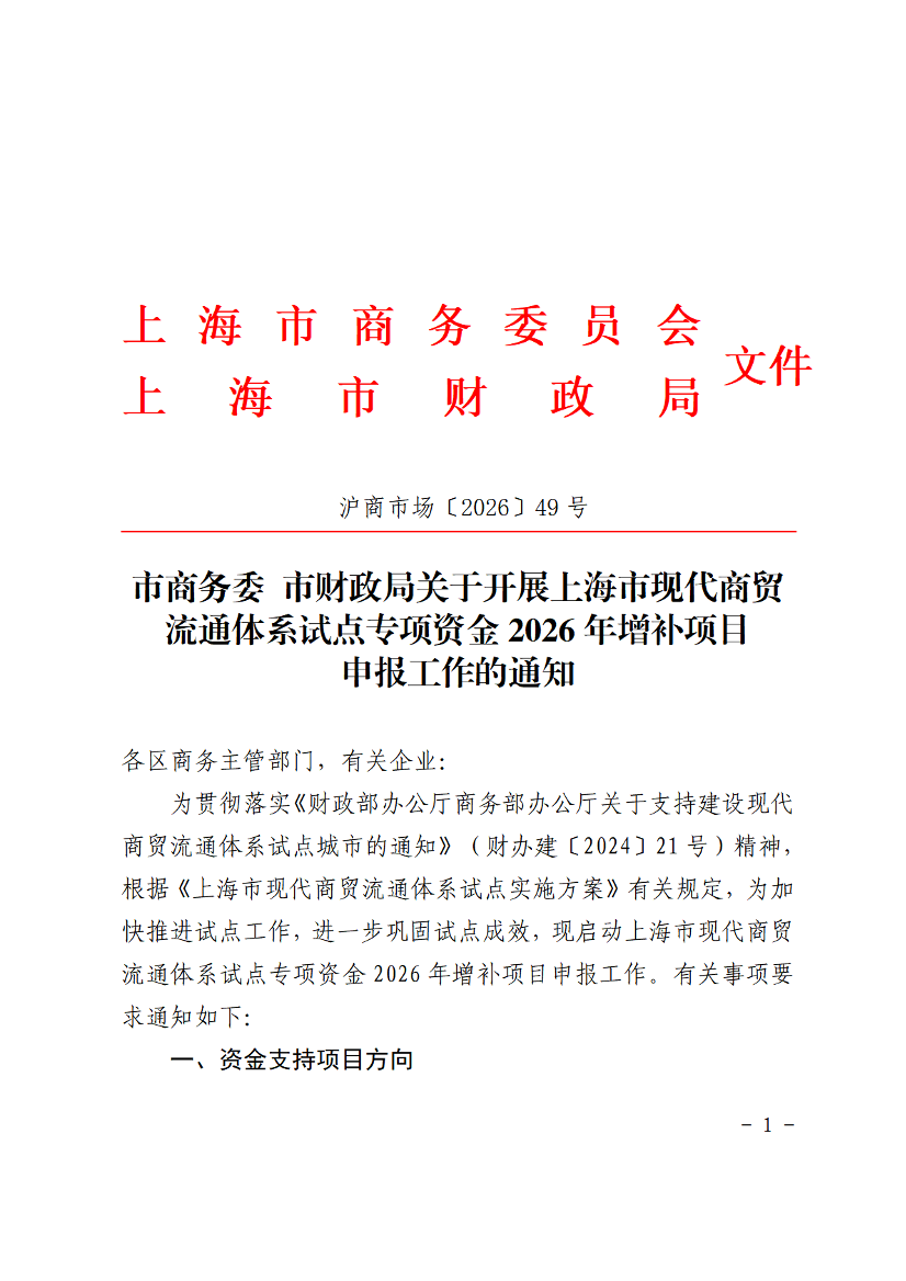 为贯彻落实《财政部办公厅 商务部办公厅关于支持建设现代商贸流通体系试点城市的通知》(财办建〔2024〕21号)精神,根据《上海市现代商贸流通体系试点实施方案》有关规定,为加快推进试点工作,进一步巩固试点成效,现启动上海市现代商贸流通体系试点专项资金2026年增补项目申报工作。有关事项要求通知如下: