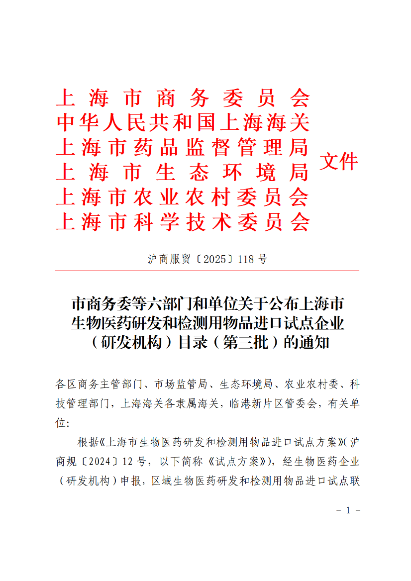 根据《上海市生物医药研发和检测用物品进口试点方案》(沪商规〔2024〕12号,以下简称《试点方案》),经生物医药企业(研发机构)申报,区域生物医药研发和检测用物品进口试点联合推进机制推荐,市级生物医药研发和检测用物品进口试点联合推进机制认定,现公布上海市生物医药研发和检测用物品进口试点企业(研发机构)目录(第三批)。