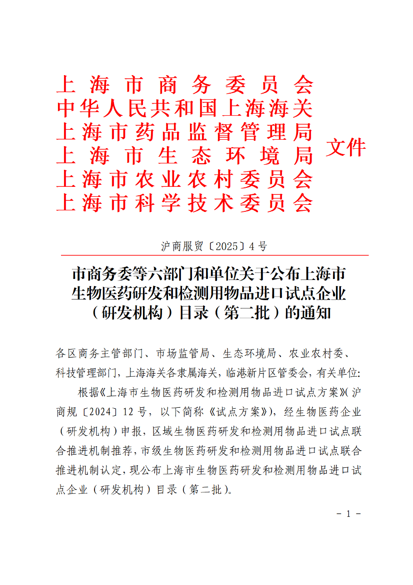 根据《上海市生物医药研发和检测用物品进口试点方案》(沪商规〔2024〕12号,以下简称《试点方案》),经生物医药企业(研发机构)申报,区域生物医药研发和检测用物品进口试点联合推进机制推荐,市级生物医药研发和检测用物品进口试点联合推进机制认定,现公布上海市生物医药研发和检测用物品进口试点企业(研发机构)目录(第二批)。
