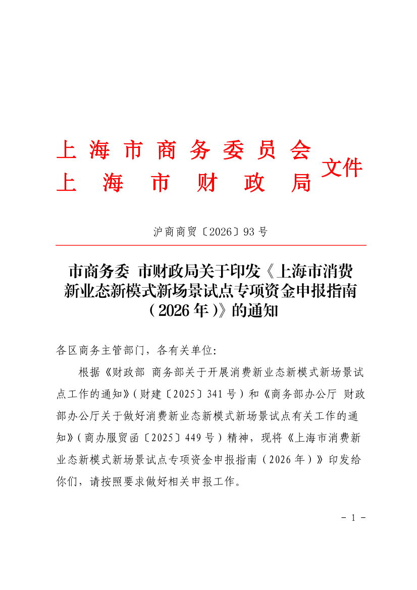 市商务委 市财政局关于印发《上海市消费新业态新模式新场景试点专项资金申报指南(2026年)》的通知