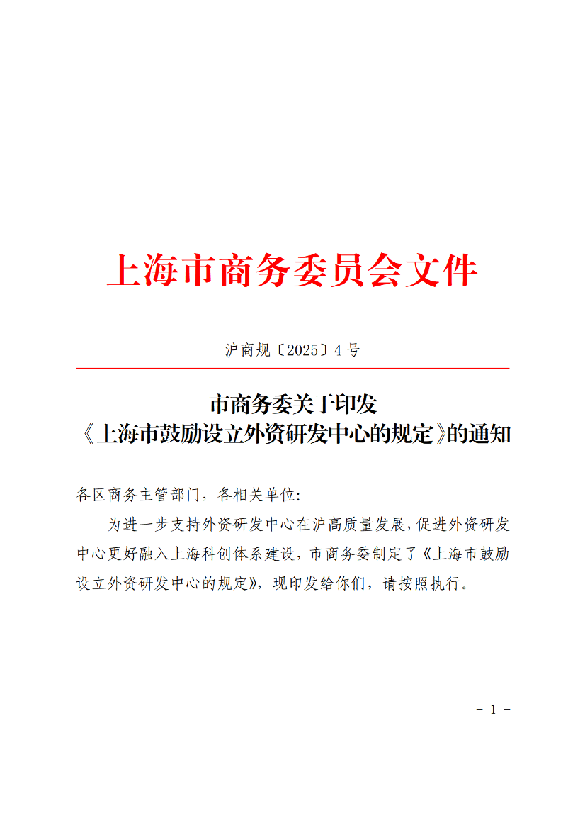 为进一步支持外资研发中心在沪高质量发展,促进外资研发中心更好融入上海科创体系建设,市商务委制定了《上海市鼓励设立外资研发中心的规定》,现印发给你们,请按照执行。